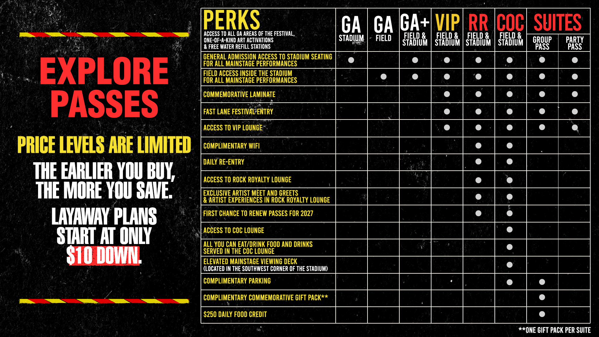 Enjoy the energy of both festivals, with each pass fulfilled as separate wristbands, so you can fully embrace each event’s unique vibe. Don’t miss out on this unbeatable combo for the most dedicated rock fans! Limited quantities, while supplies last.